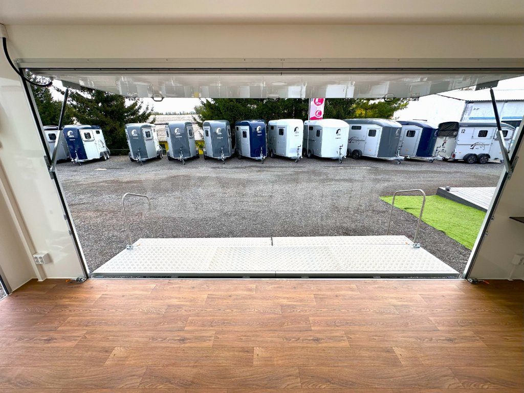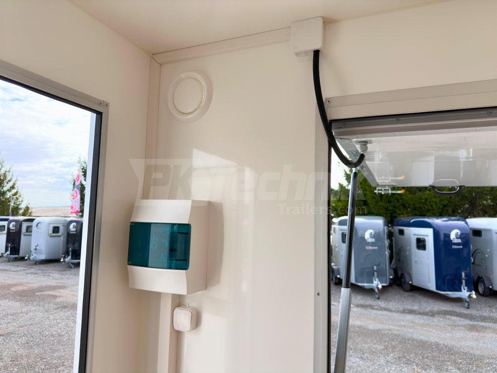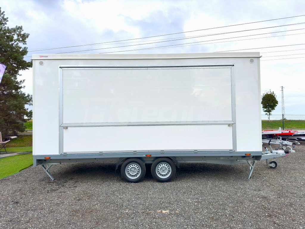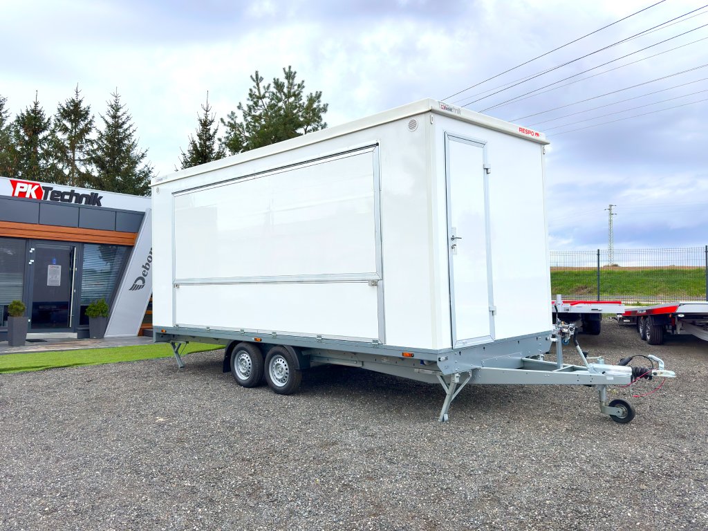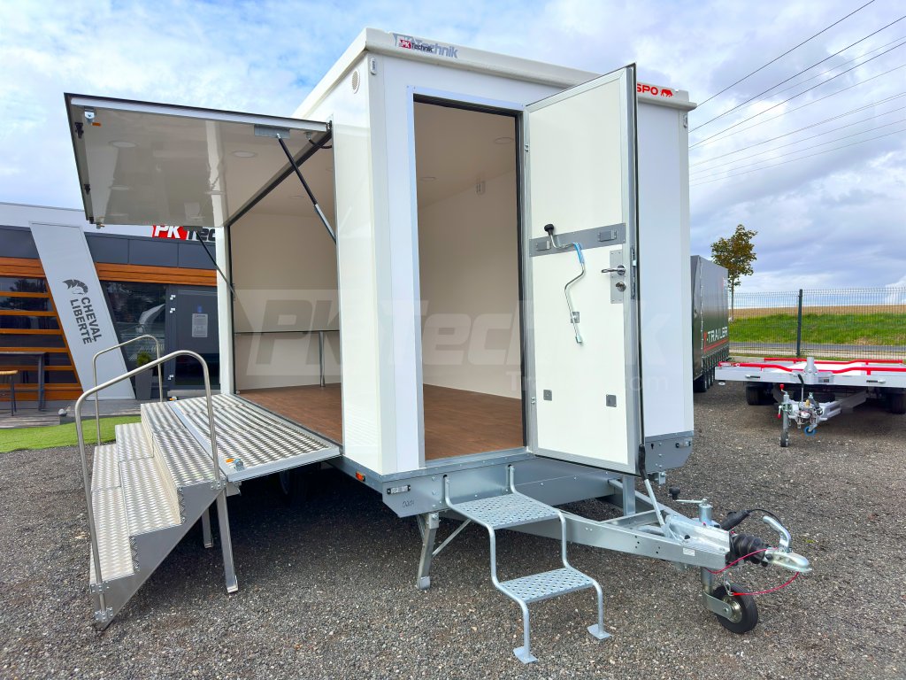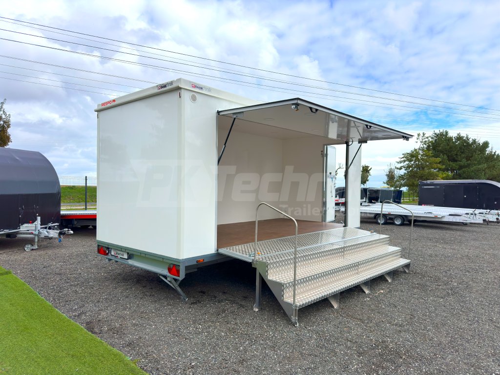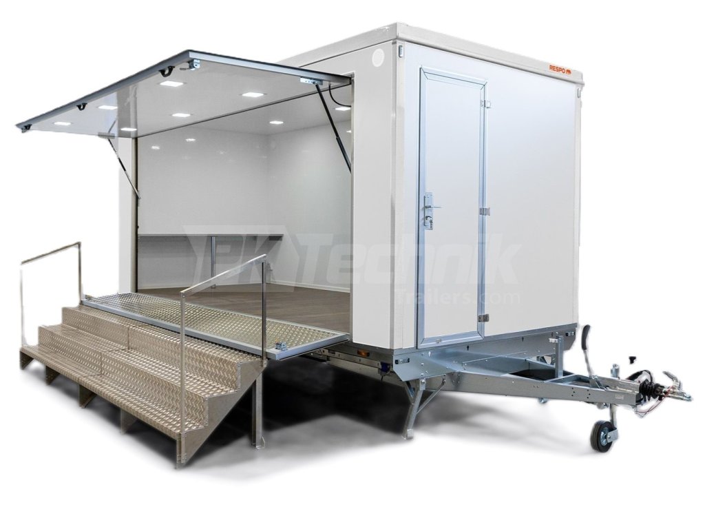 Univerzální PROMO přívěs RESPO 2000F512T220 SHOWROOM, mobilní kancelář je ideálním řešením pro prezentaci služeb nebo výrobků pro zákazníky. Přívěs RESPO T220 lze využít například pro festivaly, výstavy, veletrhy a podobné akce. Je vybaven boční výklopnou stěnou, která umožňuje mít přívěs zcela otevřen, nebo otevřen pouze z poloviny a využít ho jako prodejní stánek, například pro občerstvení zákazníků. Spodní výklopný panel okna je vybaven odolnou, protiskluzovou, hliníkovou deskou, kterou lze využít pro prodloužení plochy schodů. Ve standardní výbavě u přívěsu RESPO T220 jsou 4 opěrné nohy, pro podporu stability přívěsu.