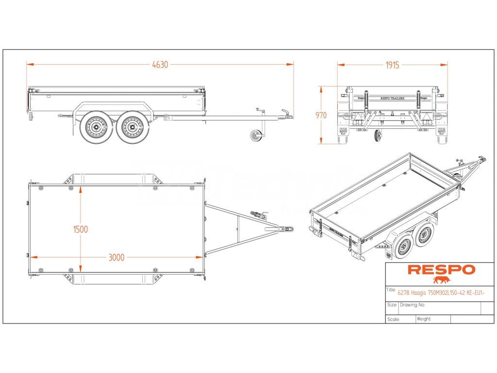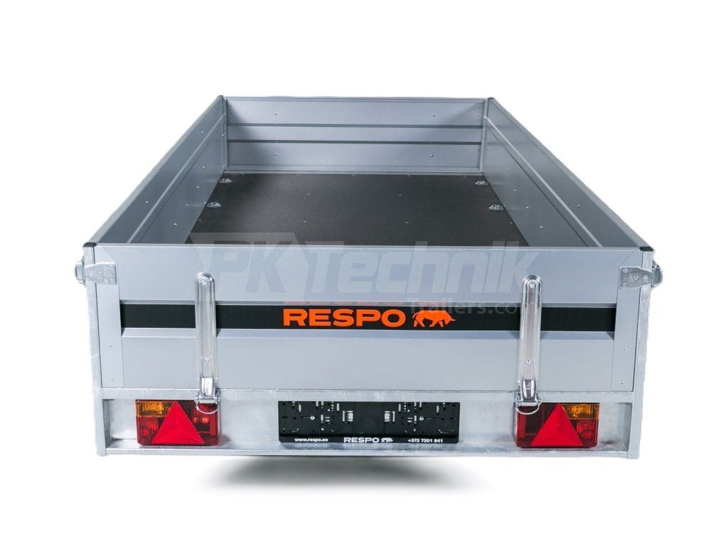 Extrémně odolný nebrzděný přívěsný vozík RESPO 750M302L150 včetně PVC HARDTOPU. Přívěs vyniká oproti běžným přívěsným vozíkům především díky robustnímu žárově zinkovanému rámu z "C" profilu, robustní nápravě s listovým odpružením a tlumiči, která je o mnoho odolnější nežli běžné torzní nápravy, a v neposlední řadě jsou kolové jednotky osazeny voděodolnými ložisky, která se běžně aplikují u přívěsů pro lodě, a mají až 3x delší životnost nežli standardní ložiska. Bočnice přívěsu jsou otevíratelné nejen v zadní, ale také v přední části. Vyrobeny jsou z robustního plechu s povrchovou úpravou Magnelis ®, která je až 3x odolnější proti korozi, díky chemickému složení zinku s příměsemi hliníku a hořčíku. Podlaha je z 12 mm silné laminátové voděodolné překližky.