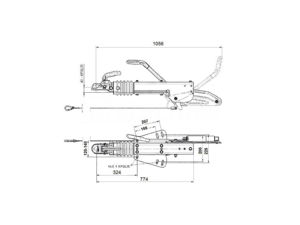 Nájezdová brzda KNOTT KFGL35-D je určena pro horní i spodní montáž na oj ve tvaru „ V ". Nájezdová brzda je dodávána kompletní, včetně tažné kulové spojky KNOTT K35-C a pojistného lanka.