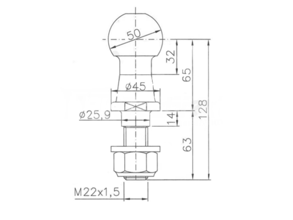 Tažný kulový čep, WINTERHOFF KUB/50 třídy A50-X, universální tažné zařízení 3500 kg, vhodné pro montáž do otvoru průměru 26 mm, tloušťky materiálu minimálně 15 mm. Součástí balení samopojistná matice M22x1,5 a podložka.