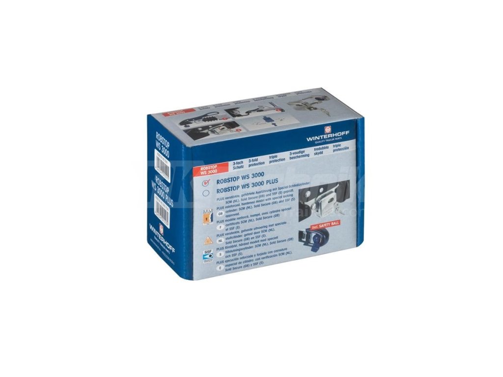 Bezpečnostní sada Winterhoff ROBSTOP WS 3000 poskytuje ochranu proti neoprávněnému odpojení přívěsu, připojení přívěsu k jinému vozidlu a demontáži tažného zařízení. Chrání také před náhodným odpojením přívěsu během jízdy. Při použití s odpojeným přívěsem je možno použít bezpečnostní kouli pro vyplnění kulovitého prostoru spojovacího zařízení. Manipulace se zařízením ROBSTOP WS 3000 je velmi snadná. Kovové prvky zařízení jsou vyrobeny z kvalitní oceli. Plastová bezpečnostní koule a zámková vložka se 2 klíči jsou součástí dodávky.