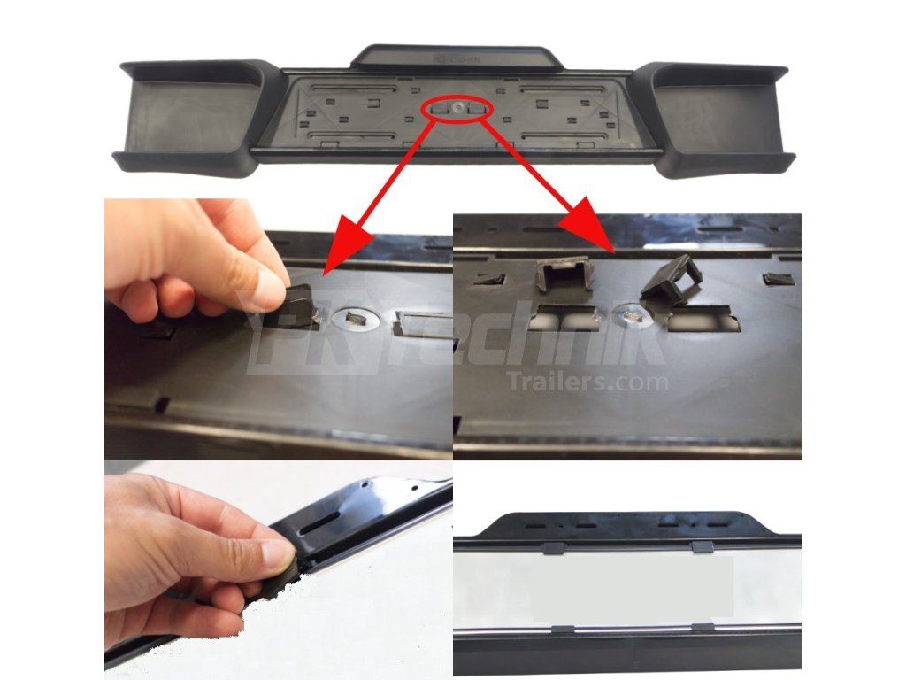 - Tabulka registrační značky se upevní do držáku zasanutím do plastových háčků na spodní straně. Nahoře se následně zajistí dvěma zacvakávacími háčky, které se před tím vylomí z prostřední části držáku.