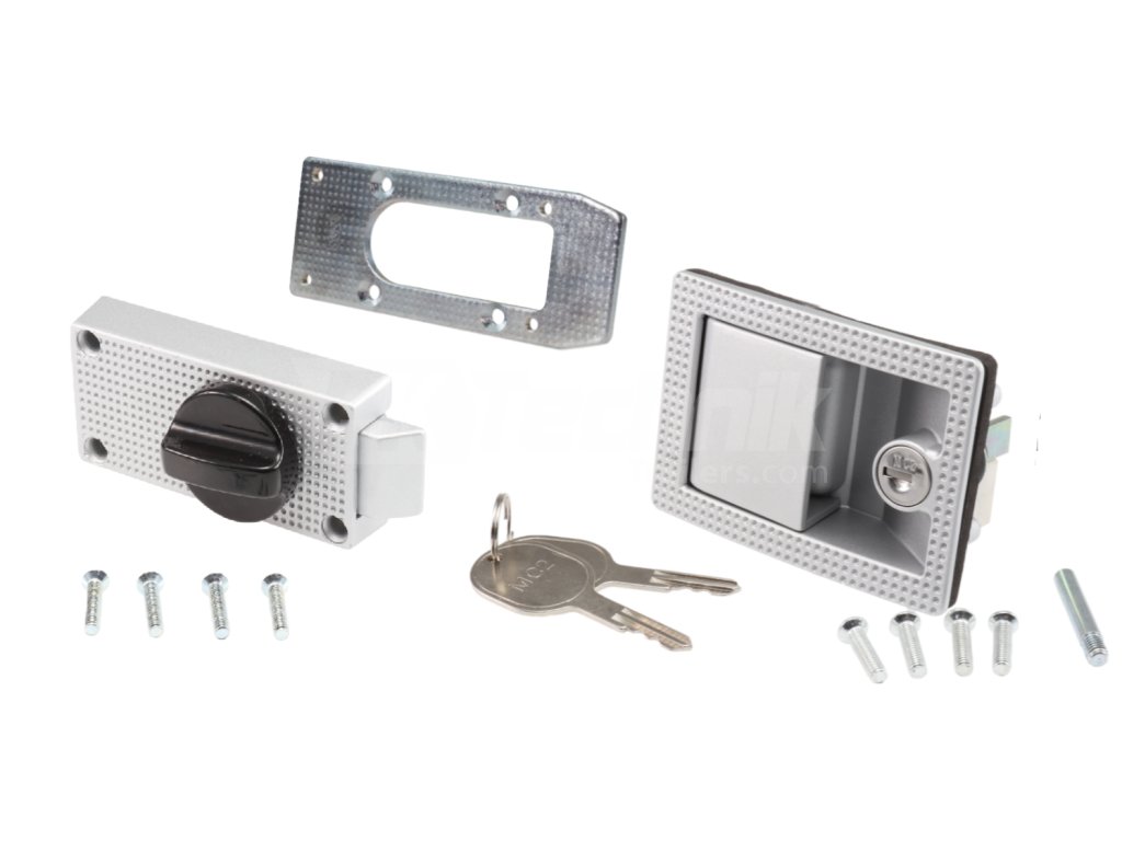 Kompletní sada zámku dveří, je ideální pro zajištění bočních dveří přívěsů na přepravu koní, karavanů či obytných vozů. Komponenty jsou vyrobeny z kvalitní slitiny zinku a hliníku, což zajišťuje vysokou tvrdost, odolnost proti korozi a dlouhou životnost.